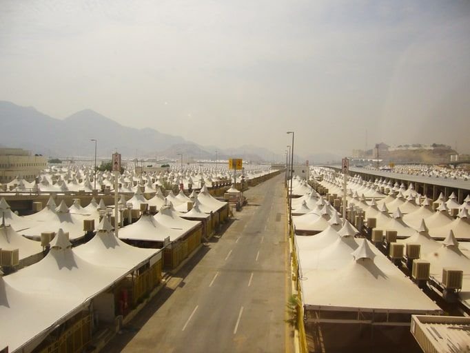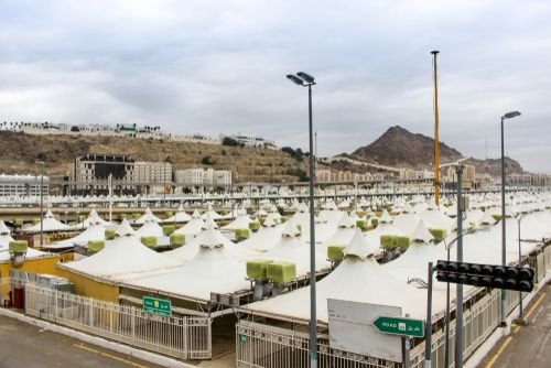 Experience a serene spiritual atmosphere in Mina with VIP tent accommodations featuring cooling systems, spacious seating, and attentive service for your comfort on this sacred day.